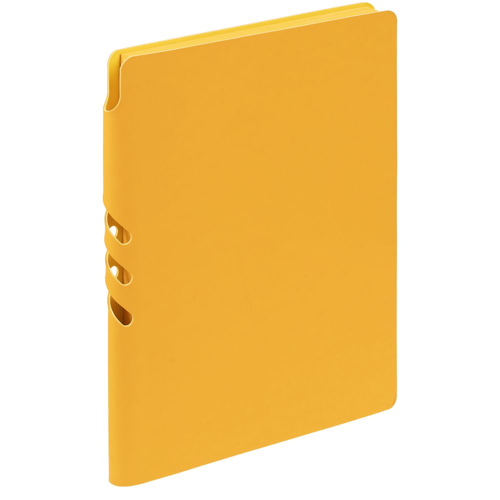 Гибкая обложка выполнена из материала Soft Touch, желтый КК и Latte, желтый КК (внутренняя часть обложки). Внутри корешка специальное место для крепления ручки размером до 15х1 см.
