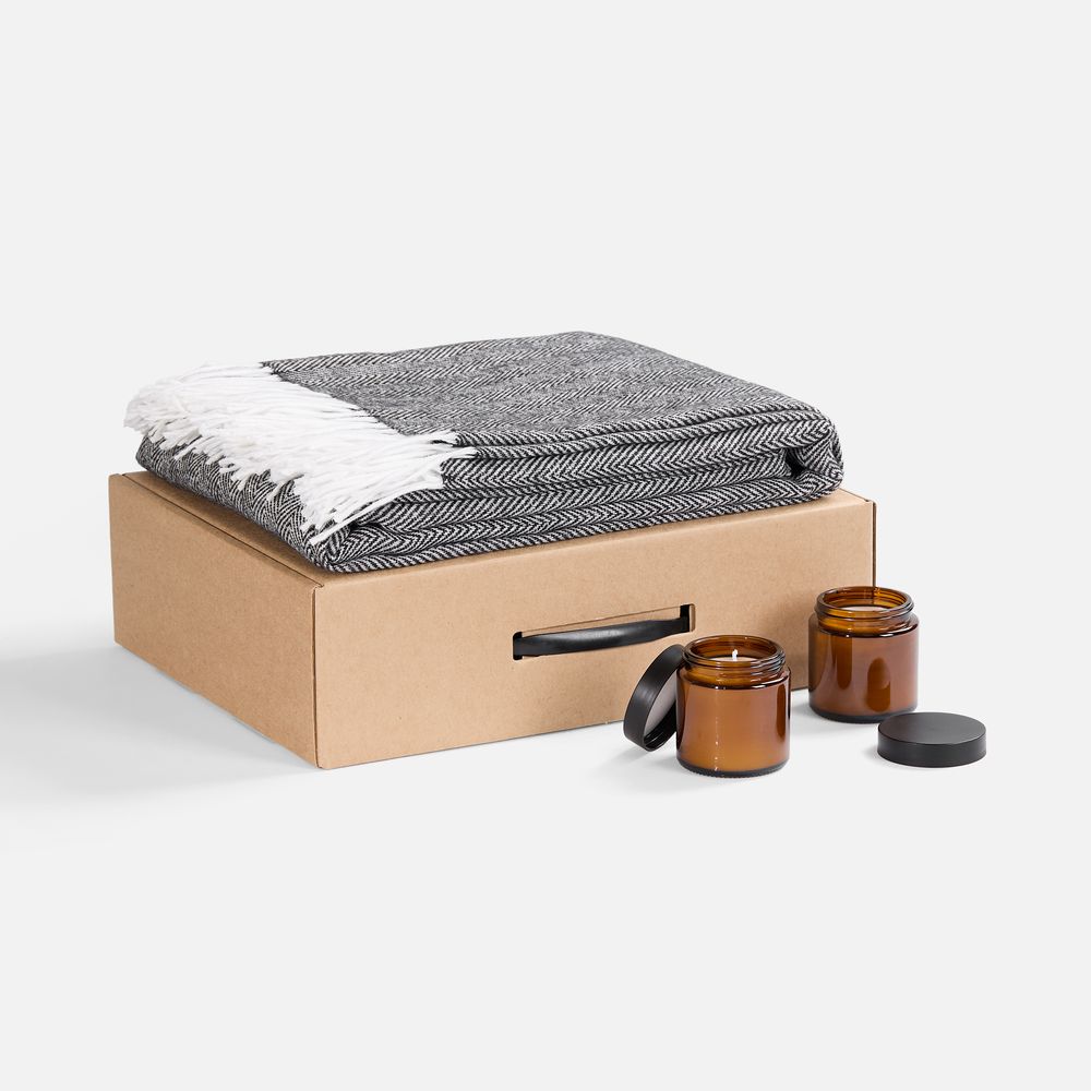 Мягкий плед с нежной бахромой станет идеальным спутником для расслабляющих вечеров, создавая комфорт и стильный облик в любом интерьере. Две ароматические свечи в элегантных стеклянных баночках наполнят пространство расслабляющим мягким светом и тонким ароматом, добавляя нотки спокойствия и гармонии.