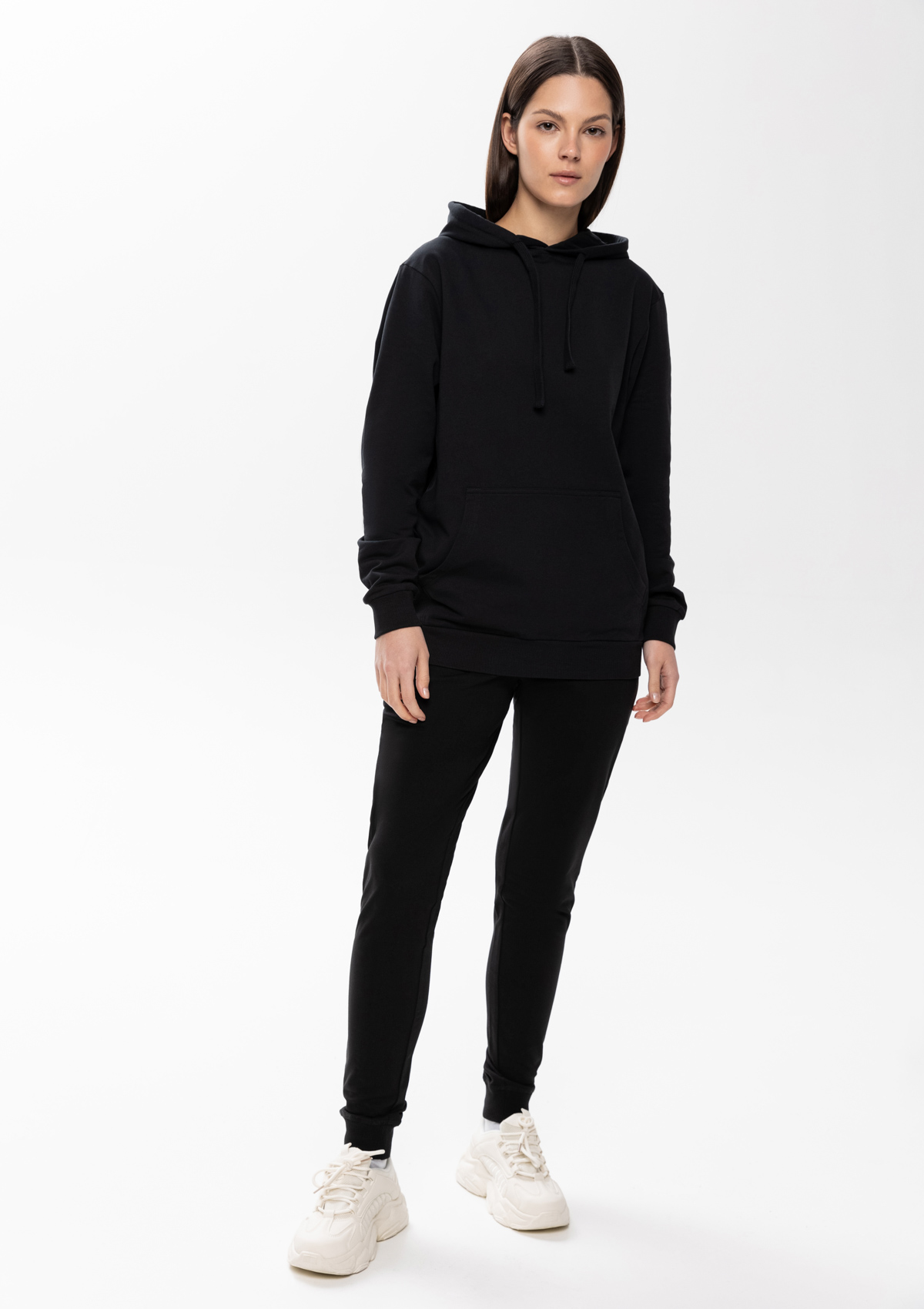 Толстовка прямого силуэта с капюшоном, втачным рукавом и карманом-кенгуру. Капюшон дополнен шнурком для регулирования прилегания, манжет и низ изделия оформлены широкой эластичной резинкой. Возможно два варианта исполнения: контрастные шнурок и бейка/шнурок и бейка в цвет толстовки.<br />