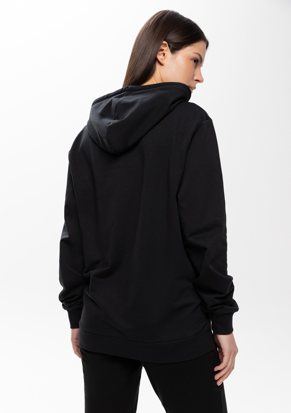 Толстовка прямого силуэта с капюшоном, втачным рукавом и карманом-кенгуру. Капюшон дополнен шнурком для регулирования прилегания, манжет и низ изделия оформлены широкой эластичной резинкой. Возможно два варианта исполнения: контрастные шнурок и бейка/шнурок и бейка в цвет толстовки.<br />