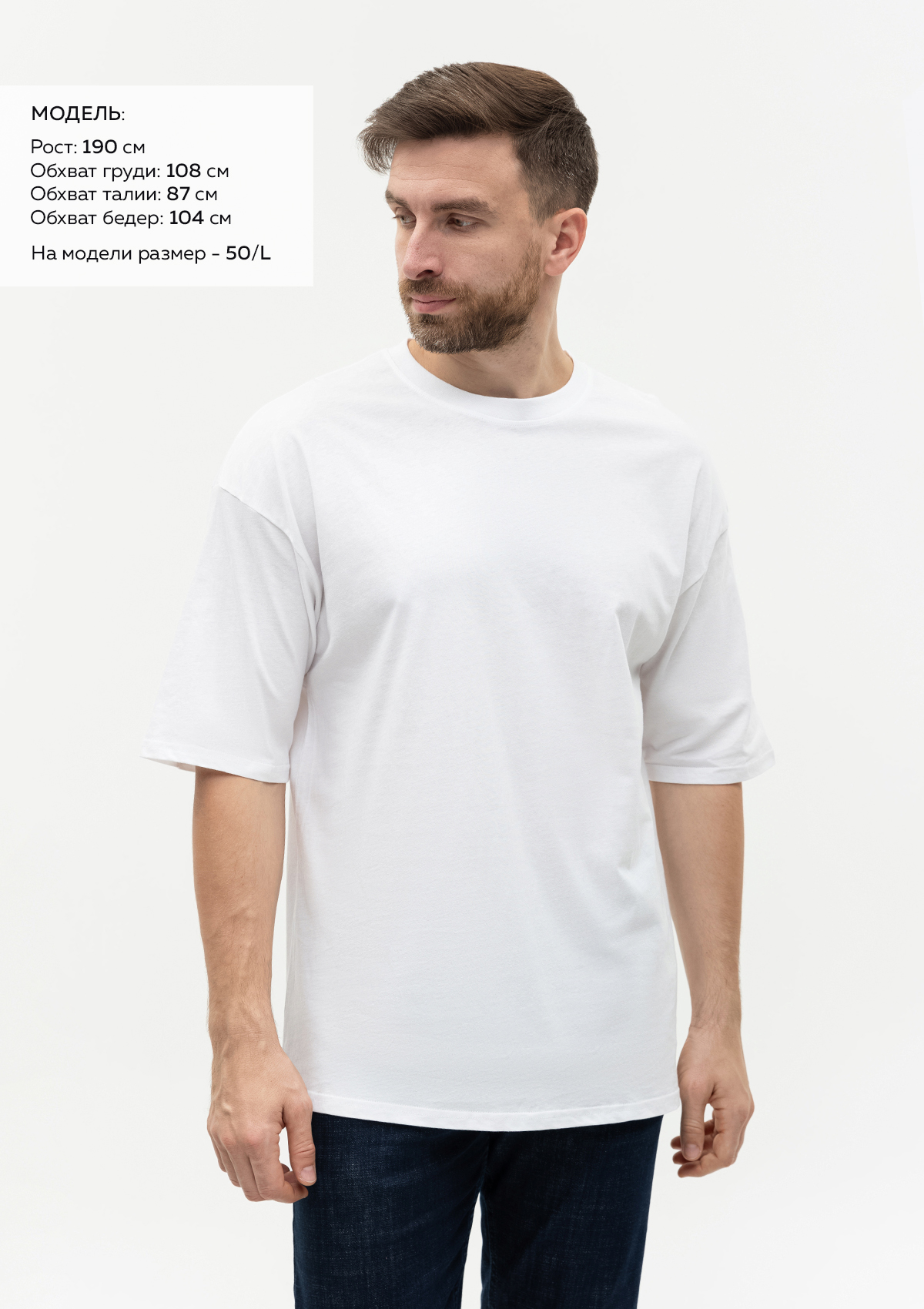 Главный тренд последних сезонов, футболка в стиле oversize, привлекает внимание благодаря непринужденному крою, натуральному составу и демократичной стоимости. В сочетании с вашим авторским дизайном, модель станет сокрушительным аргументом на любом event-мероприятии, спортивном соревновании или студенческом слете.<br /> <br /> Свободная футболка силуэта-oversize с округлым воротом и спущенной линией плеча. Универсальная модель идеально впишется как в мужской, так и в женский гардероб.<br /> <br /> Изделие изготовлено из мягкого и комфортного к телу материала кулирная гладь. Материал не теряет форму, не мнется даже при активной носке. Футболка воздухопроницаемая, приятная на ощупь и не пилингуется после стирок.<br /> <br /> Размер мужской футболки: 50/L. Параметры модели: рост 190 см.; обхват груди 108 см.; обхват талии 87 см.; обхват бедер 104 см.