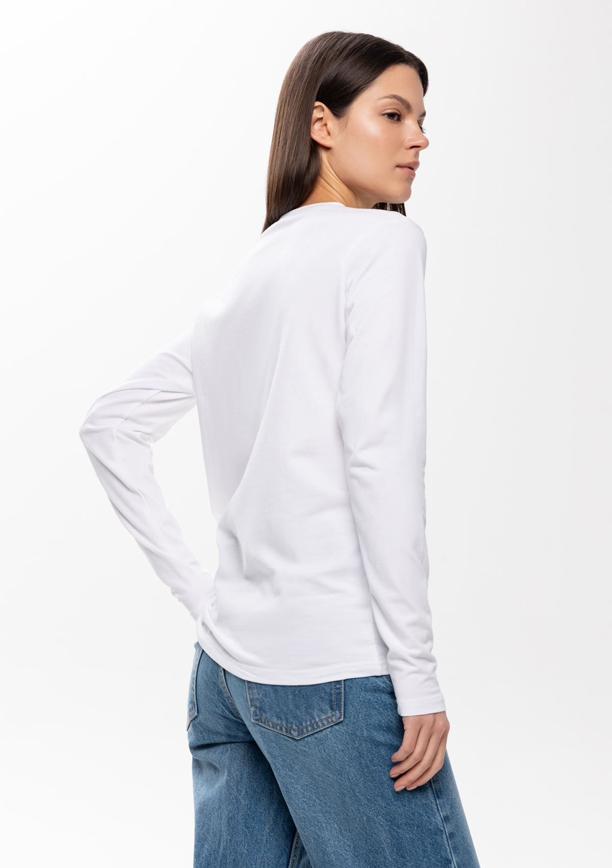 Универсальная футболка прямого силуэта с округлым воротом и длинным втачным рукавом. Плечевые швы и шов горловины усилены настрочной бейкой из основного полотна.<br />