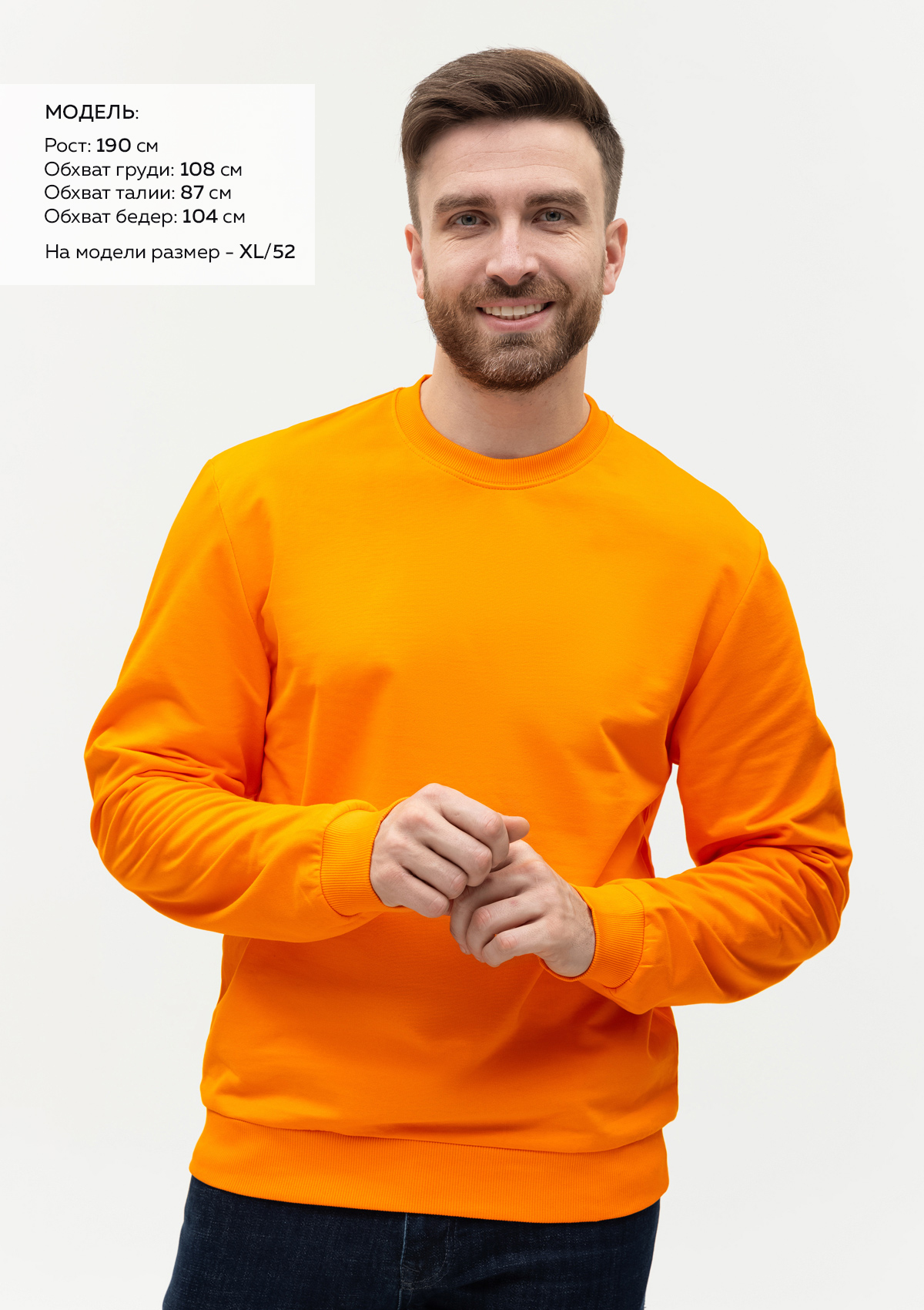 Размер мужского свитшота: XL/52. Параметры модели: рост 190 см.; обхват груди 108 см.; обхват талии 87 см.; обхват бедер 104 см.Характеристики: