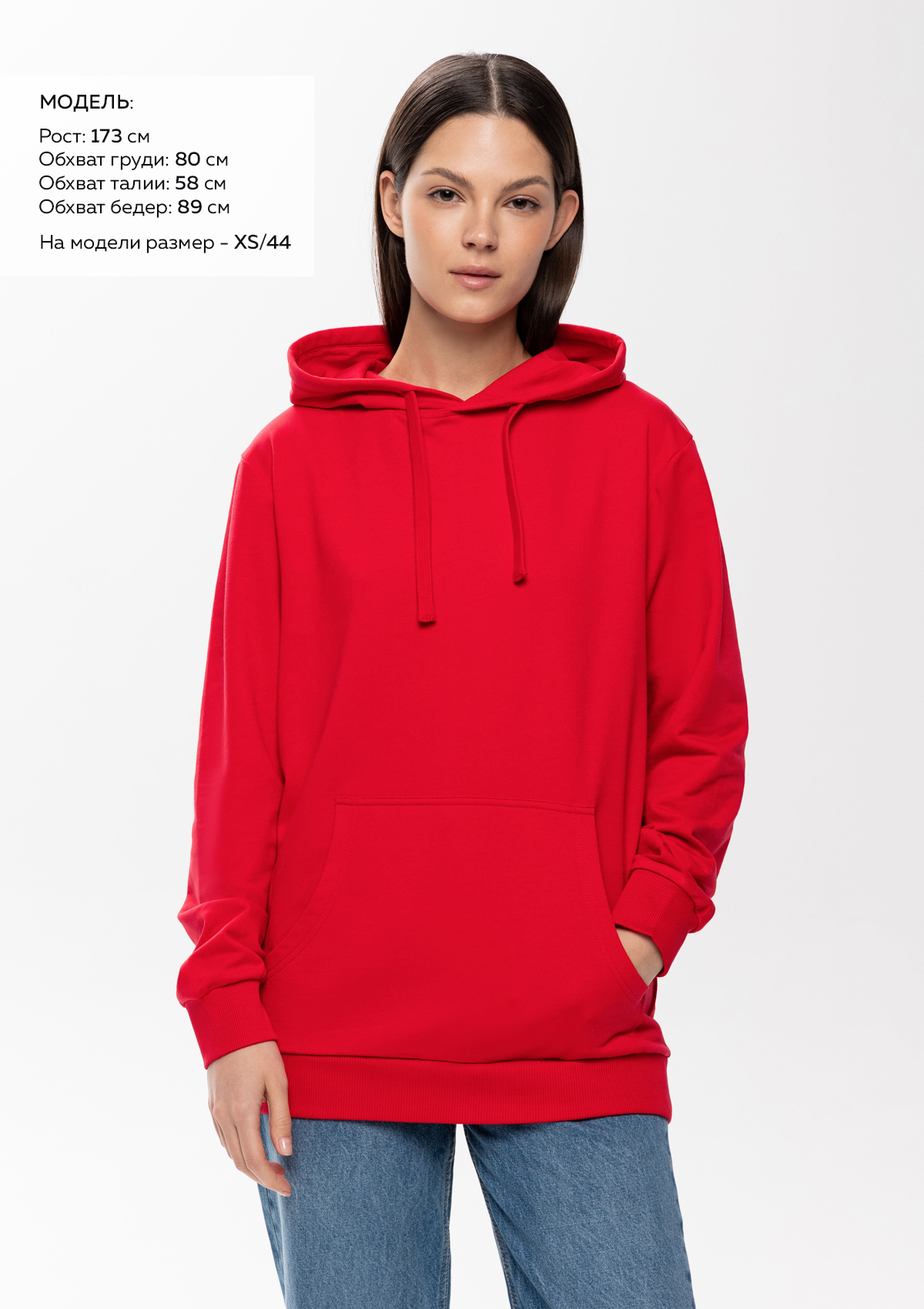 Размер женского худи: XXS/42. Параметры модели: рост 173 см.; обхват груди 80 см.; обхват талии 58 см.; обхват бедер 89 см.<br />
