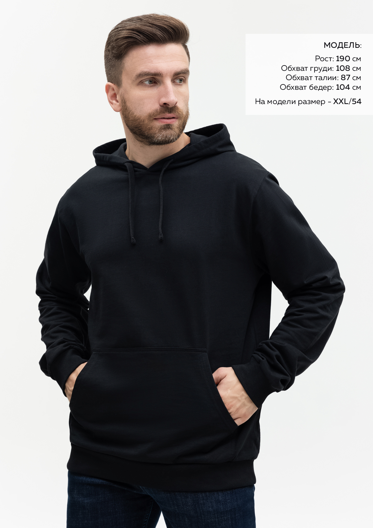 Размер мужского худи: XL/52. Параметры модели: рост 190 см.; обхват груди 108 см.; обхват талии 87 см.; обхват бедер 104 см.Характеристики: