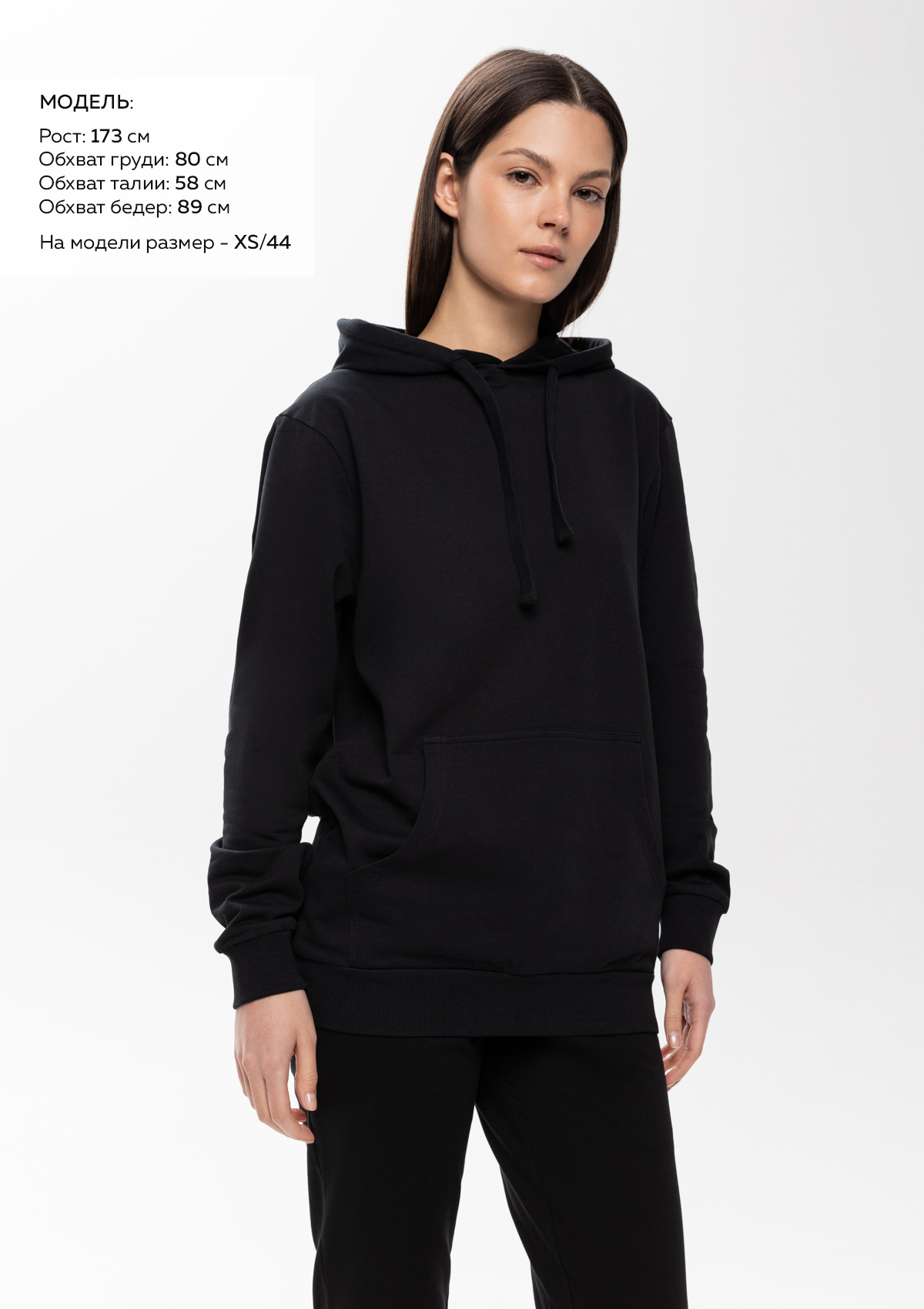 Размер женского худи: XXS/42. Параметры модели: рост 173 см.; обхват груди 80 см.; обхват талии 58 см.; обхват бедер 89 см.<br />