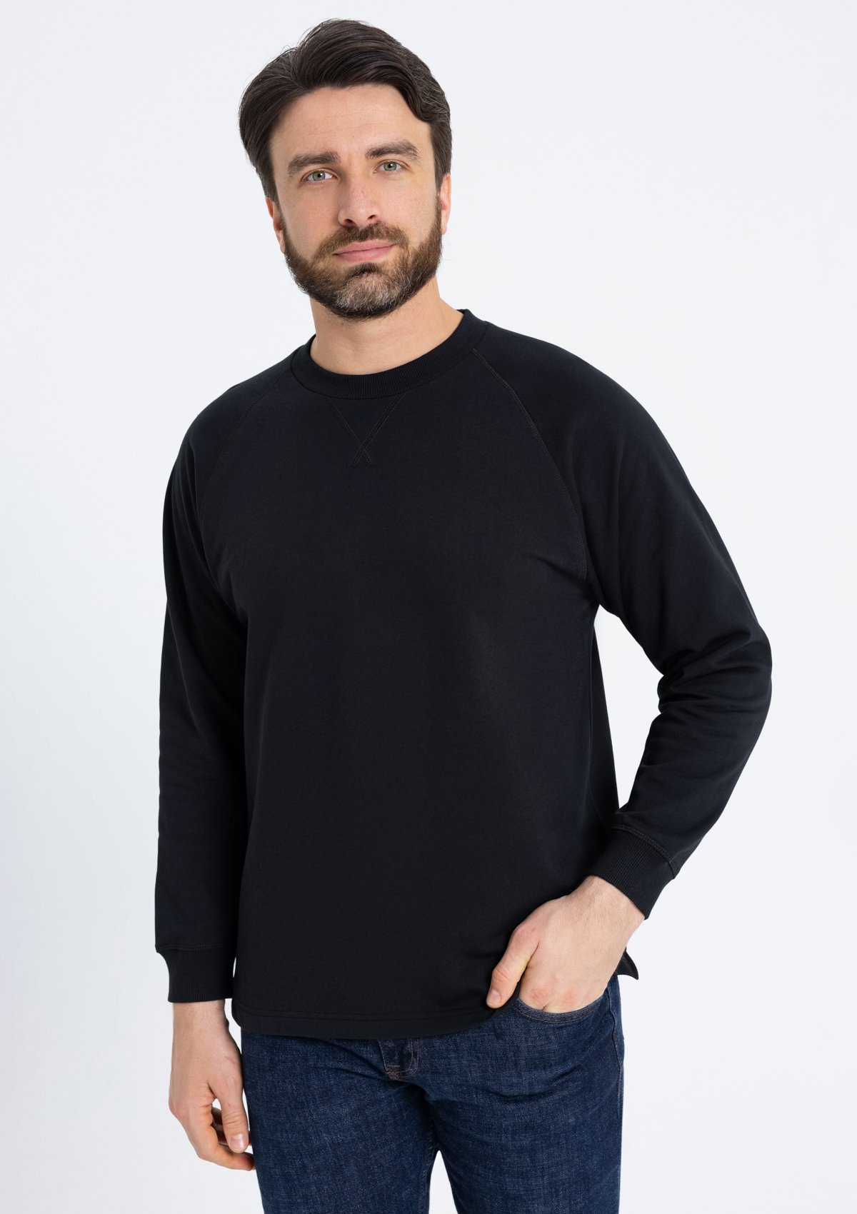 Свободный силуэт, округлый вырез, рукав-реглан и декоративные элементы, отсылающие к классическому крою. Ворот и манжет выполнены широкой эластичной резинкой. <br />
