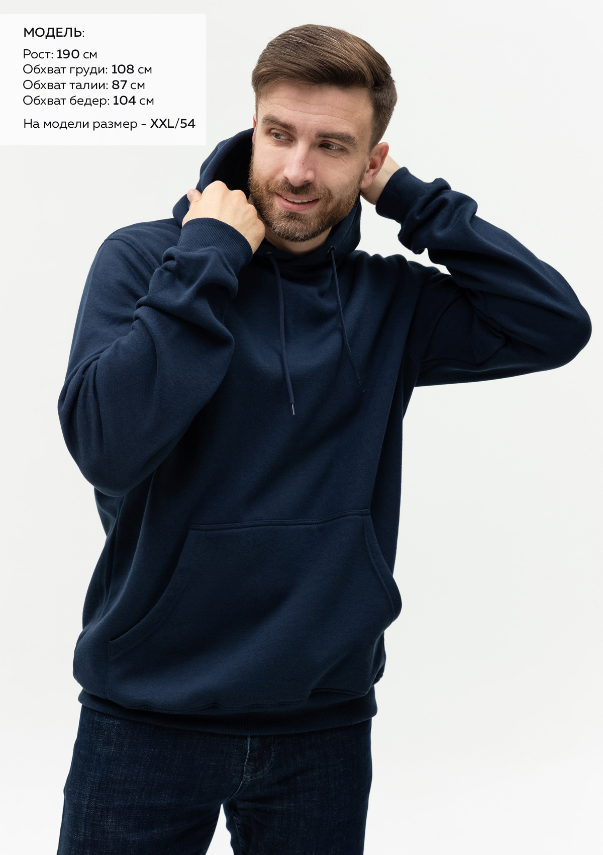Исключительно мягкая толстовка в сочетании с вашим ярким и привлекательным дизайном создадут беспроигрышную комбинацию стиля, комфорта и творчества. Изделие подойдет в качестве элемента деловых и повседневных образов, порадует участников студенческих и спортивных мероприятий, запомнится в качестве креативного подарка.<br /> <br /> Толстовка унисекс прямого силуэта с капюшоном, втачным рукавом и карманом-кенгуру. Капюшон дополнен шнурком для регулирования прилегания, манжет и низ изделия оформлены широкой эластичной резинкой. Возможно несколько вариантов исполнения толстовки. <br /> <br /> Модель выполнена из мягкого износостойкого футера &#40;60&#37; хлопок, 40&#37; полиэстер&#41;. Материал хорошо сохраняет тепло и отводит влагу, а расслабленный крой гарантирует свободу движения. <br /> <br /> Размер мужского худи: XXL/54. Параметры модели: рост 190 см.; обхват груди 108 см.; обхват талии 87 см.; обхват бедер 104 см.