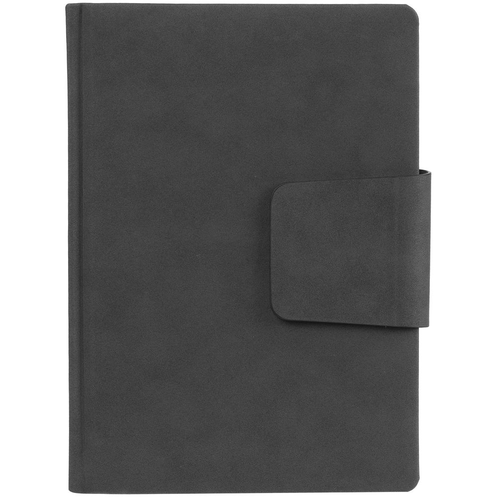 Ежедневник с твердой обложкой c поролоном, выполнен из материала Nubuck, темно-серый ЕЕ, дополнен капталом и ляссе черного цвета. Застежка магнитный хлястик.