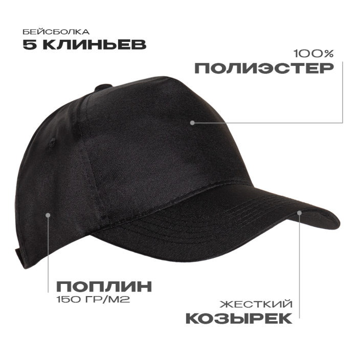Бейсболка STAN 5 клиньев полиэстер 150, 10P (Чёрный, 56-58/ONE SIZE)