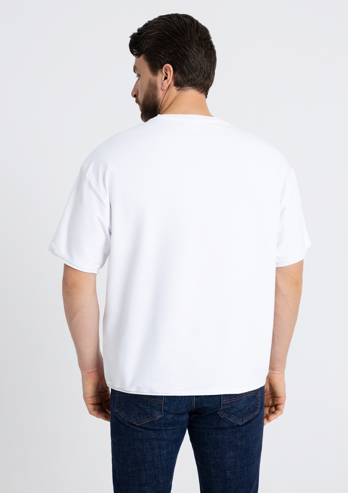 Футболка свободного силуэта с необработанными краями поможет создать стильный и неформальный образ. Данную футболку легко сочетать с джинсами, юбками и шортами, что делает модель универсальным выбором как для мероприятий, так и для униформы.<br /> <br /> Футболка оверсайз-силуэта со спущенной линией плеча и необработанным краем рукава, горловины и по низу изделия.<br /> <br /> Изделие выполнено из легкого, но плотного материала футера 2 нитки &#40;95&#37; хлопок, 5&#37; эластан&#41;.<br /> <br /> Размер мужской футболки: XL/52. Параметры модели: рост 190 см.; обхват груди 108 см.; обхват талии 87 см.; обхват бедер 104 см.