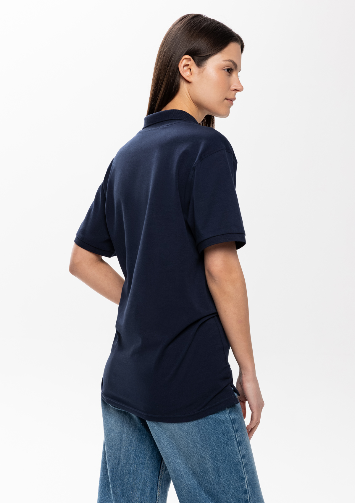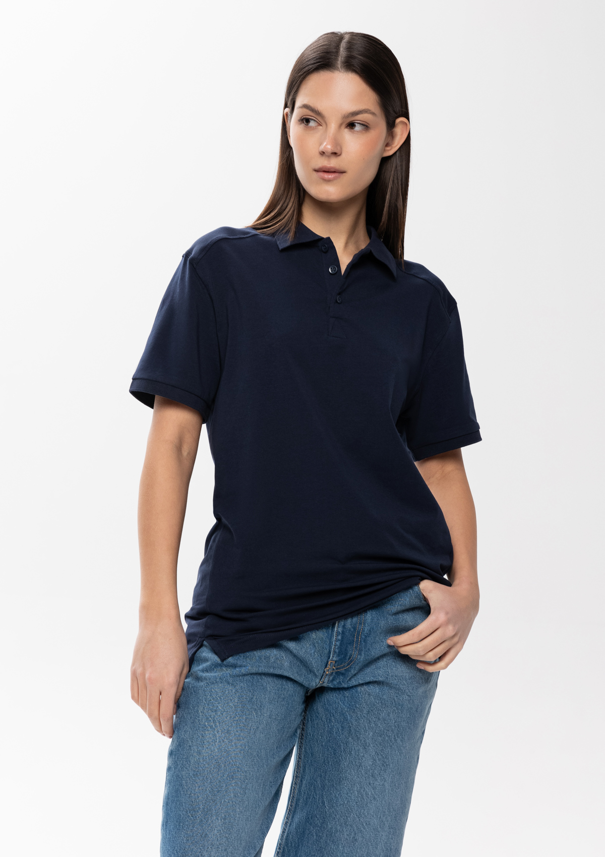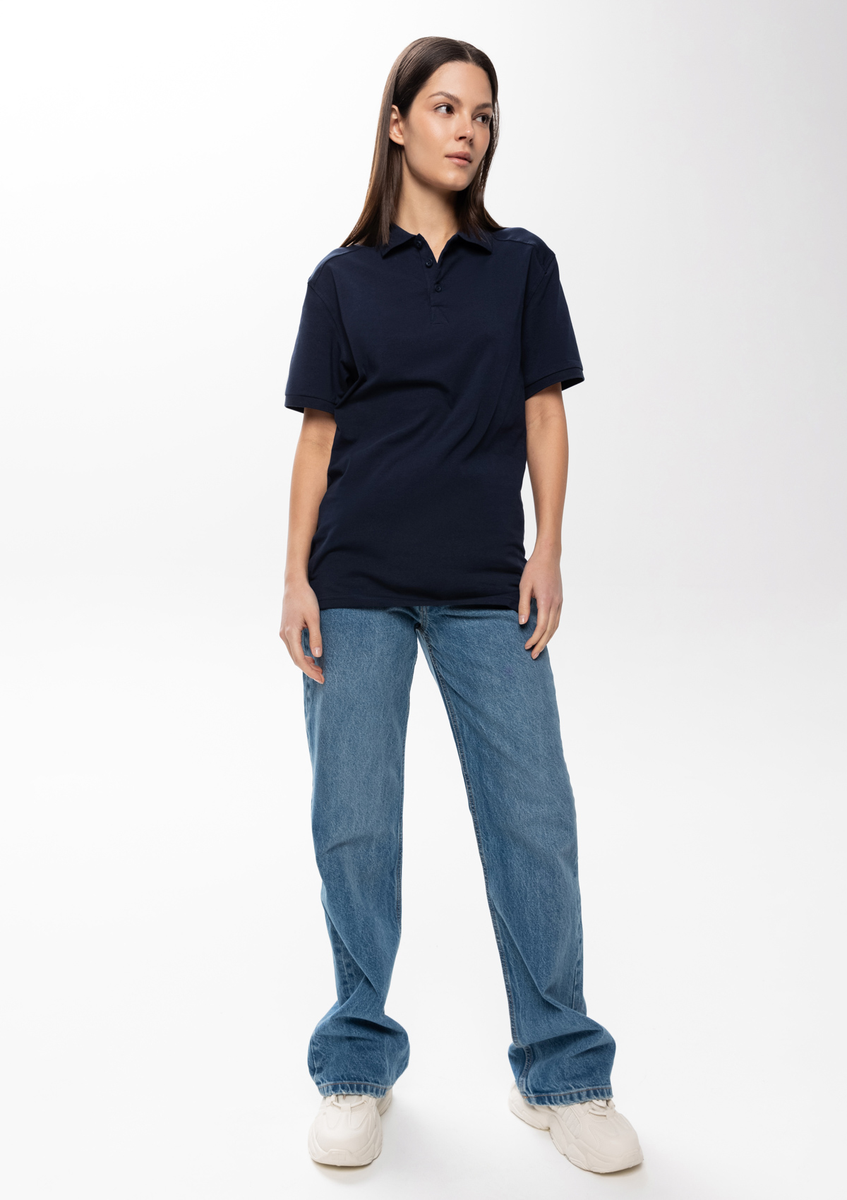 Поло прямого кроя с отложным воротником, втачанным коротким рукавом и застежкой на пуговицы в тон.<br />